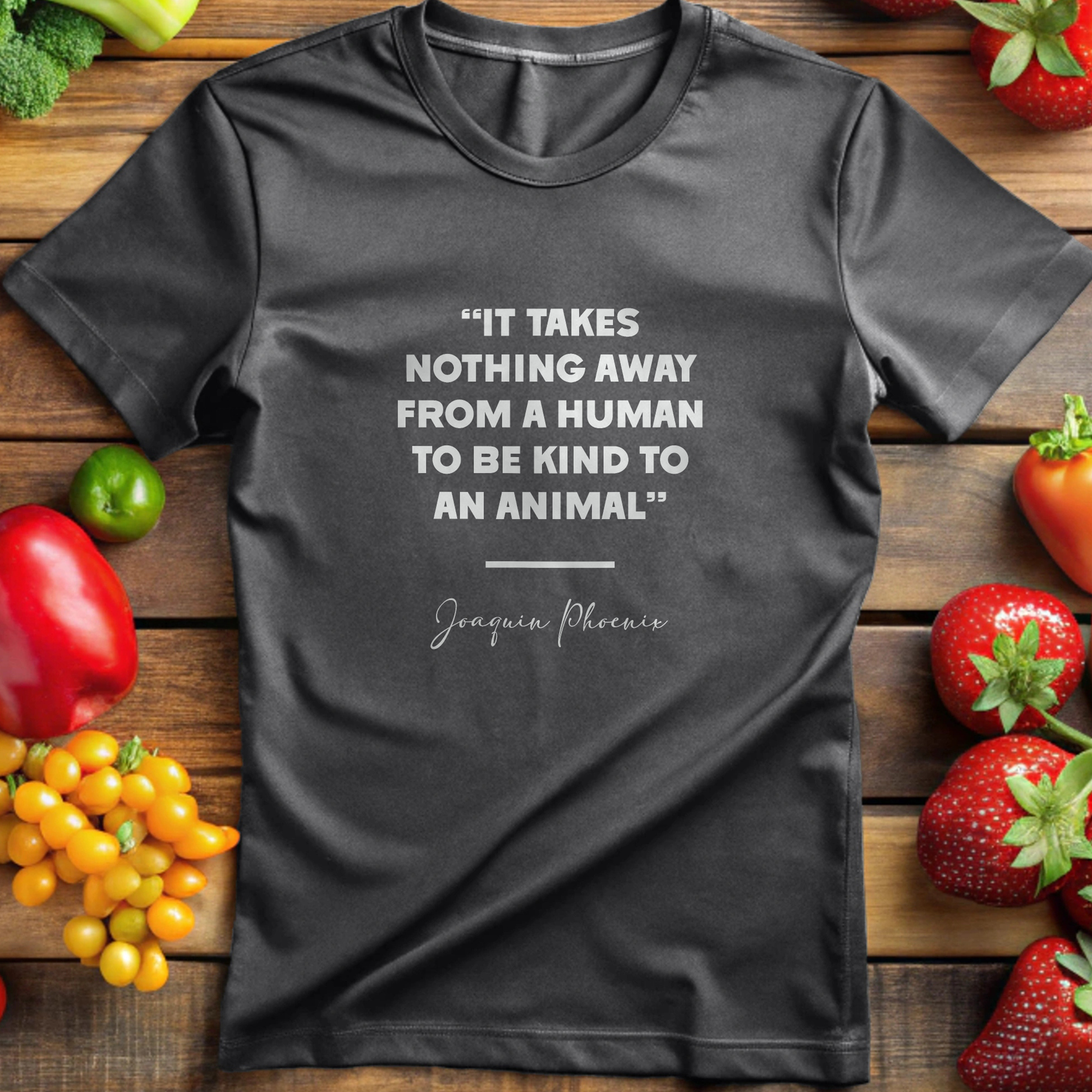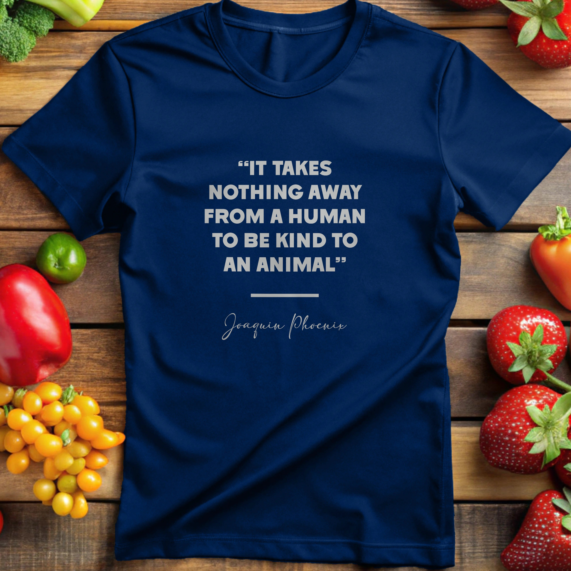 With quiet strength and unwavering truth, Joaquin Phoenix reminds us: “It takes nothing away from a human to be kind to an animal.” With this T-shirt, you carry that message forward. A simple yet powerful statement when you believe compassion is the highest form of strength.