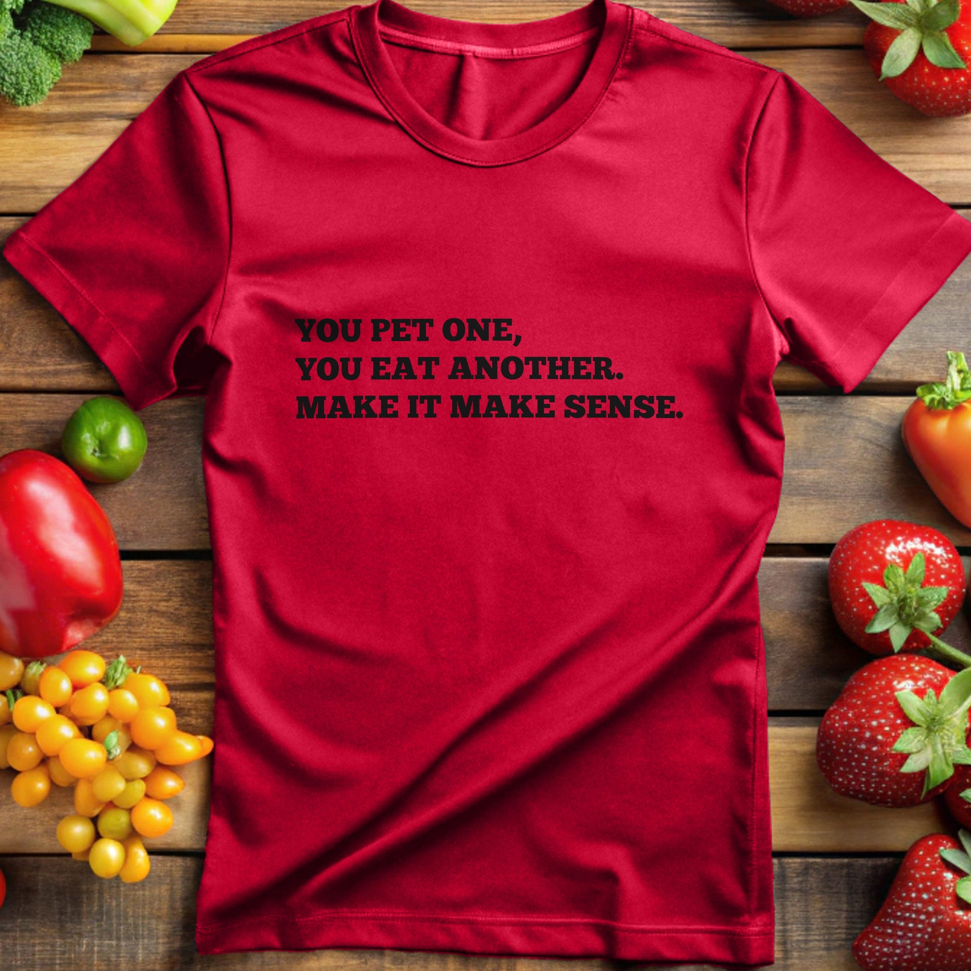 You stroke your dog’s ears with love, but eat a pig’s ribs without question? The You Pet One, You Eat Another, Make It Make Sense T-shirt calls out the contradiction with honesty, impact, and just the right amount of attitude. It’s a wearable wake-up call that turns heads and opens hearts.